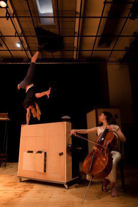 RépétitionsJoris Frigerio (L’ésprit) en équilibre sur piano à coté du violoncelle virtuose d’Astrig Siranossian